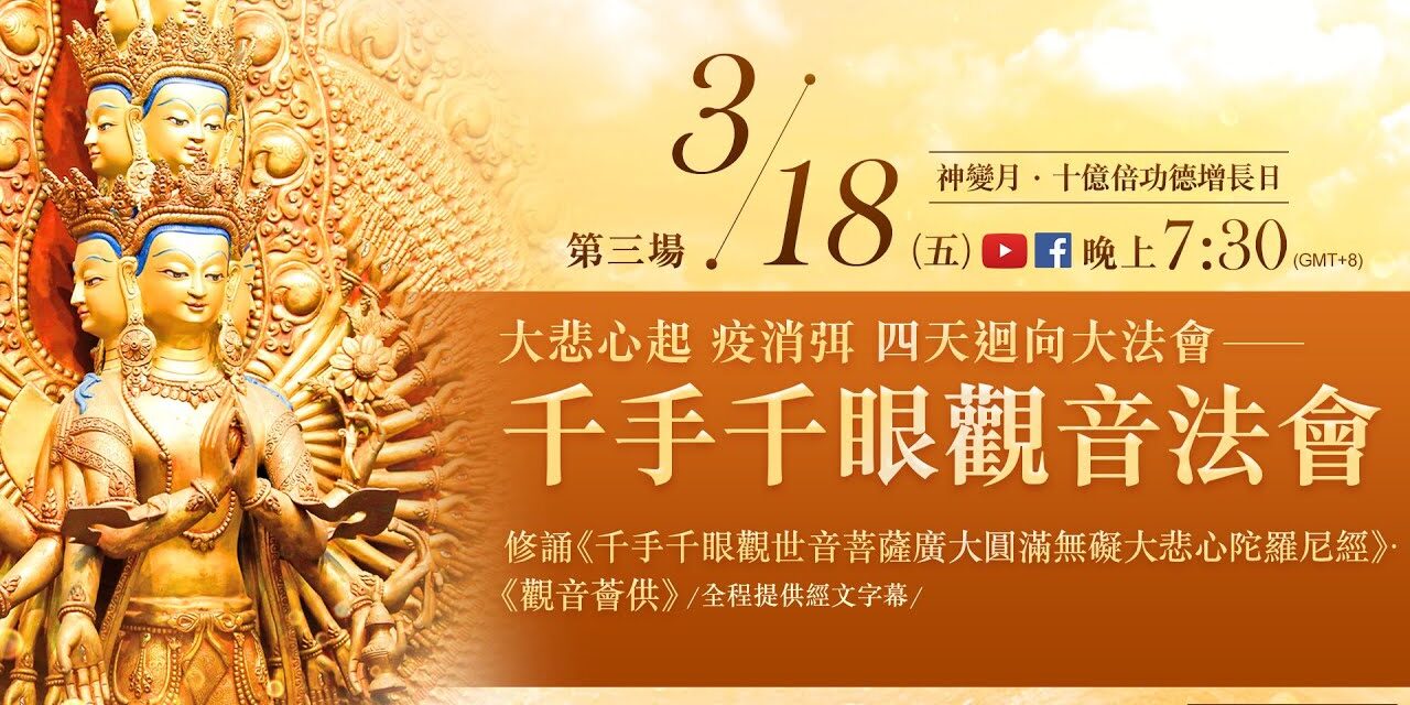 ?【3月18日觀音山LIVE直播】千手千眼觀音法會 | 神變月 | 大悲心起 疫消弭四天迴向大法會 第3場,晚上7:30 (GMT+8)。