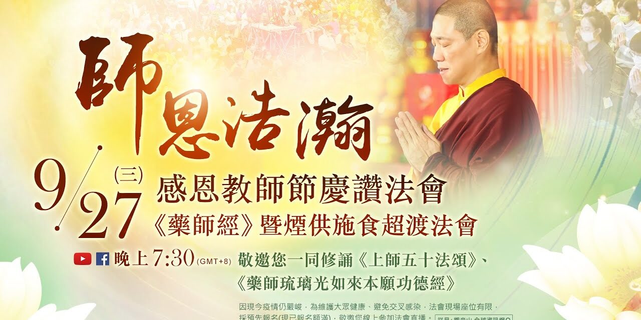 【9月27日觀音山LIVE直播】2023 師恩浩瀚 感恩教師節慶讚法會|《藥師經》暨煙供施食超渡法會,晚上7:30 (GMT+8)。